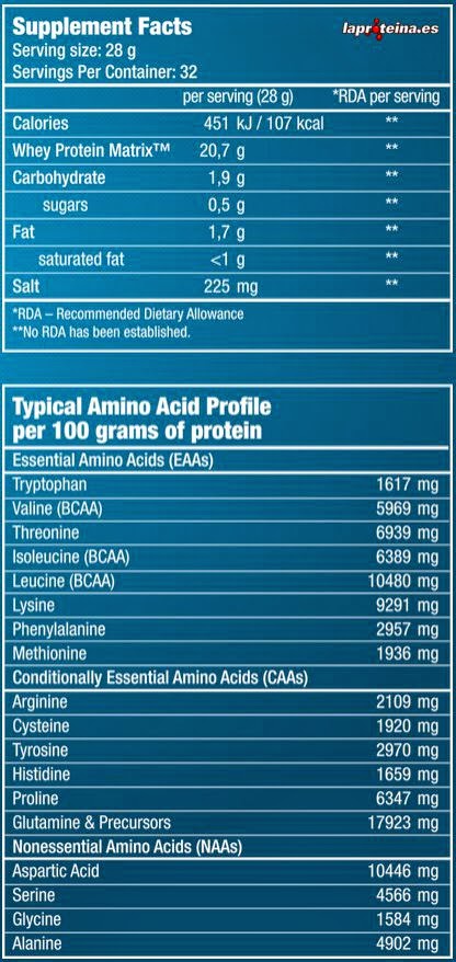 Cada servicio de 28 gramos aporta 20,7 gramos de proteína procedentes únicamente del extracto de proteína de suero de leche, incluyendo aislado y concentrado de suero, todo ello obtenido con una moderna tecnología de microfiltración con el proceso de flujo cruzado en frío patentada.