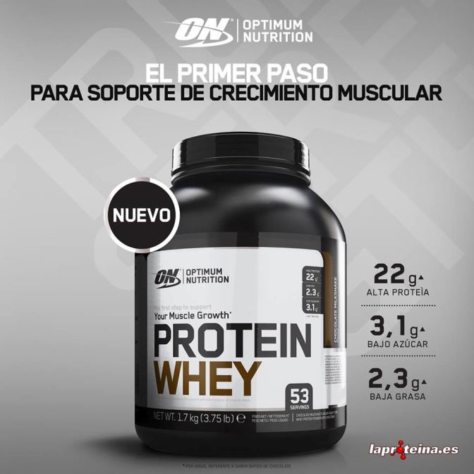 Protein Whey es nueva versión ligeramente diferente su proteína estrella 100% Whey Gold Standard de la compañía número 1 en todo el mundo Optimum Nutrition (ON). Se trata de un suplemento proteico procedente exclusivamente de suero de leche, que posee un porcentaje proteico de 71% y que proporciona 22 gramos de proteína por servicio junto con una pequeña dosis extra de hidratos de carbono que ayudan a una mejor y más completa absorción de los aminoácidos por los músculos.