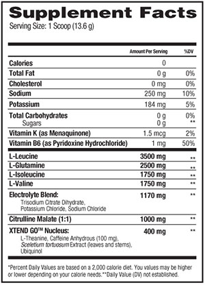 Xtend™ GO está formulado con una mezcla exacta de ingredientes activos sinérgicamente implicados en los procesos celulares clave para optimizar el rendimiento muscular y la respuesta al entrenamiento.