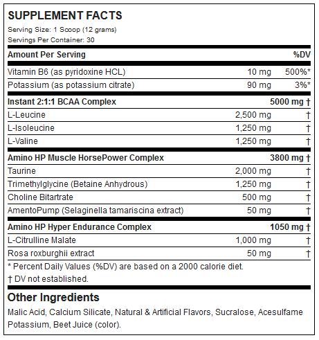 Complejo de BCAAs instantáneos 2:1:1 (L-Leucina, L-isoleucina, L-valina), complejo Amino HP Muscle HorsePower (Taurina, Trimetilglicina (betaína anhidra), Bitartrato de colina, AmentoPump (extracto tamariscina Selaginella)), Complejo Amino HP Hyper Endurance (L-citrulina malato, extracto de roxburghii Rosa), vitamina B6 (como piridoxina HCl) y potasio (como citrato de potasio).