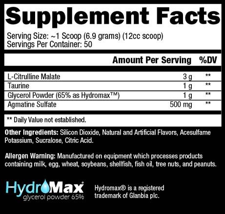- Contiene L-citrulina malato, taurina, Hydromax™ y agmatina sulfato.