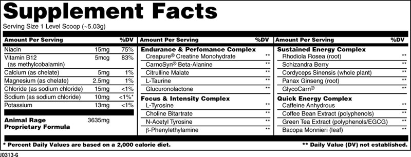 Creapure® (Creatina Monohidrato), CarnoSyn® (Beta Alanina), Citrulina Malato, L-Taurina, Glucoronolactona; L-Tirosina, Colina Bitartrato, N-Acetil Tirosina, B-Feniletilamina, Raíz de Rhodiola Rosea, Schisandra Chinensis, Cordyceps Sinensis (Planta Entera), Raíz de Panax Ginseng, GlycoCarn®, Cafeína Anhidra, Café Verde (Polifenoles), Té Verde (Extracto) (Polifenoles (EGCG)), Bacopa Monnieri (Hoja).