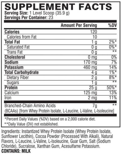 Aislado de proteína de suero instantáneo (aislado de proteína de suero, lecitina de girasol), cacao en polvo (procesado con álcali), sabores naturales, L-leucina, L-valina, L-isoleucina, goma guar, sal (cloruro de sodio), sucralosa, goma de xantano, Acesulfamo de potasio.