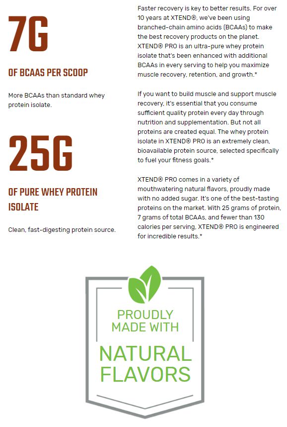 Los BCAAs añadidos hacen que XTEND® PRO sea un elemento clave en tu nutrición enfocada a la recuperación. Con 25 gramos de proteína y 7 gramos totales de BCAAs por dosis, XTEND® PRO está diseñada para ayudarte a obtener unos resultados increíbles.