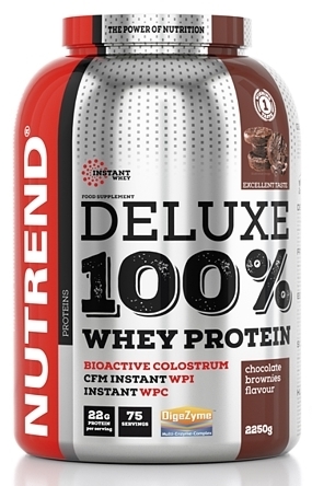 Deluxe 100% Whey Protein de Nutrend® es un suplemento de alta calidad que contiene una mezcla proteica exclusiva compuesta por concentrado y aislado de proteína de suero, que ha sido enriquecida con calostro rico en compuestos bioactivos que le otorgan unas características y cualidades únicas, fortaleciendo el sistema inmunológico y promoviendo el desarrollo de la masa muscular.