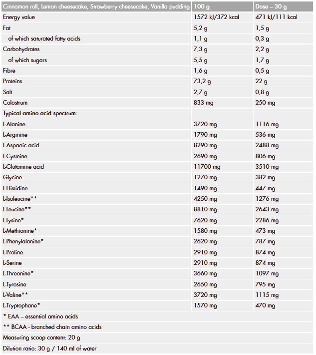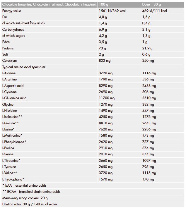 Concentrado de proteína de suero (81%), aislado de proteína de suero (13%) (Lecitina de Soja), cacao, aceite de palma, jarabe de glucosa, proteína de leche, fibra de trigo, estabilizadores (goma de acacia, goma xantana), aroma, calostro (40% inmunoglobulinas), antiaglomerante: sílice, cloruro de sodio, edulcorantes (sucralosa, glucósidos de esteviol).