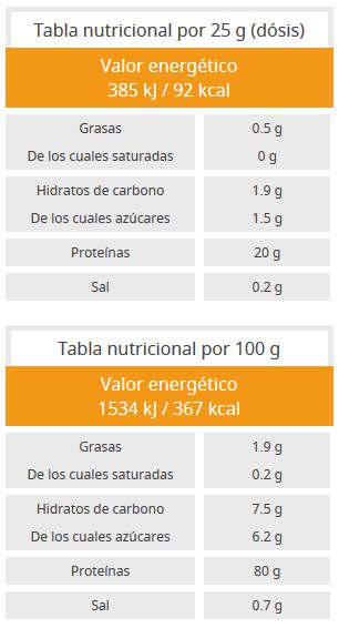 En nuestro producto hemos usado el aislado de proteína de suero de la marca Isolac® que nos asegura una alta concentración de proteína a nivel del 90% y menos de 2 gramos de carbohidratos y grasa (por toma), además siendo libre de lactosa al 99%.