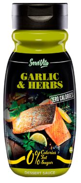Garlic & Herbs de Servivita es una rica salsa sin calorías con un toquecito de ajo y con hierbas aromáticas ideal para tus platos de pescado o pasta, a los que darás un sabor y aroma intenso, pero sin sumar ni una sola caloría a tu línea.