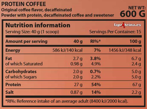 Protein Coffee Decaffeinated proporciona una efectiva dosis de 27 gramos de proteína de suero de leche junto con café descafeinado y sin azúcar, combinando a la perfección dos de los ingredientes más utilizados y populares de los complementos deportivos, como son la proteína de suero y el café (en este caso sin cafeína).