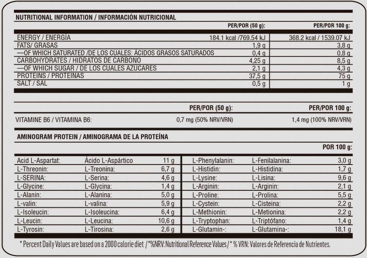 - Proporciona 37,5 gramos de proteína por servicio de 50 gramos.