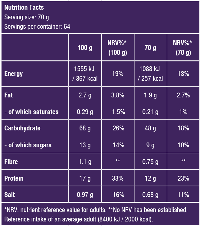 - Contiene un 17% de proteína de máxima calidad y un 67% de una matriz de carbohidratos.