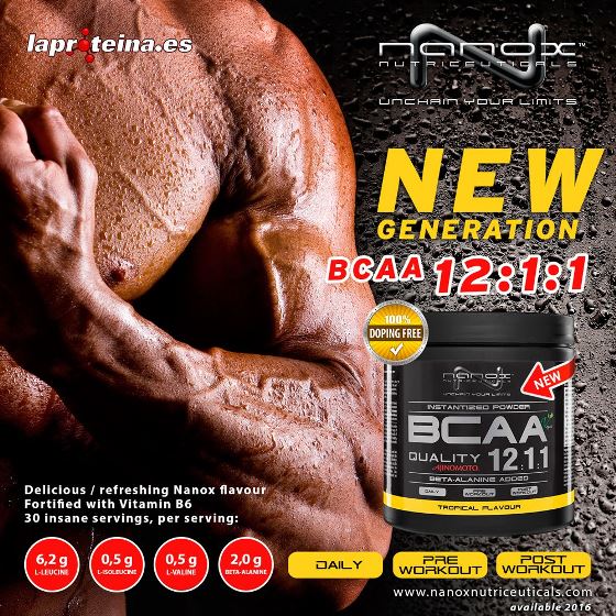 BCAA 12:1:1 Ajinomoto de Nanox™ Nutriceuticals es un suplemento nutricional en polvo que contiene aminoácidos de cadena ramificada en una proporción 12:1:1 entre leucina, valina e isoleucina reforzados con beta alanina, y que ha sido específicamente formulado para aquellos deportistas que buscan una estimulación extra de expansión de masa corporal y el crecimiento muscular extra, exigiendo un proceso de estímulo anabólico continuo e intensivo.