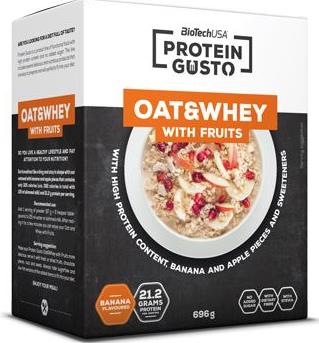 Oat & Whey with Fruits de BioTech USA dentro de su línea de comidas funcionales Protein Gusto es un producto que contiene una combinación de copos de avena y trozos de fruta con una mezcla de proteína de concentrado de suero y aminoácidos (BCAAs, glutamina y arginina), en dos versiones diferentes, una con sabor a chocolate con trozos de cereza y otra con sabor a plátano con trozos de plátano y manzana.