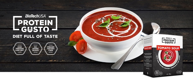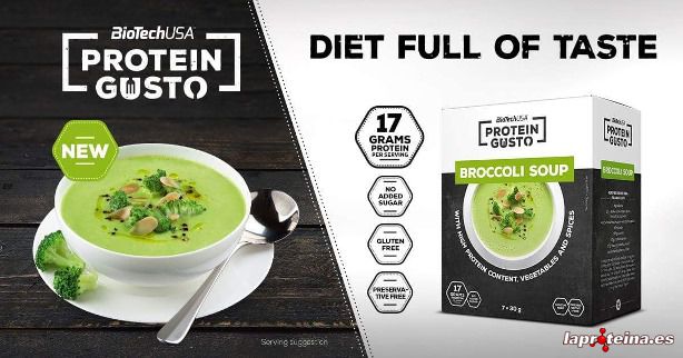 Soap de BioTech USA dentro de su línea de comidas funcionales Protein Gusto es un producto en polvo para preparar de una forma rápida y sencilla unas deliciosas y nutritivas sopas altas en proteína en tres versiones diferentes, con sabor queso, con sabor a tomate y con brócoli.