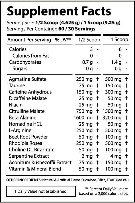 Beta alanina, citrulina malato, agmatina sulfato, L-arginina, rhodiola Rosea, cafeína anhidra, taurina, extracto de aconitum kusnezoffi, extracto de raíz de remolacha, bitartrato de DL colina, complejo de vitaminas y minerales (calcio, magnesio, ácido ascórbico (vitamina C), D-alfa tocoferol acetato (vitamina E), nicotinamida (niacina), gluconato de zinc, pantotenato D cálcico (ácido pantoténico), gluconato de cobre, sulfato de manganeso, clorhidrato de piridoxina (vitamina B6), riboflavina (vitamina B2), monohidrato de tiamina (vitamina B1), palmitato de refinio sódico (vitamina A), ácido fólico, biotina, yoduro potásico, cloruro de cromo, molibdato sódico, selenito sódico, colecalciferol (vitamina D), cianocobalamina (vitamina B12)), dicafeína malato, niacina, homadina HCl, extracto de serpentina, aromas, edulcorante (sucralosa), antiaglomerante (dióxido de silicio) y colorante (rojo allura E129).