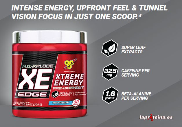 N.O.-Xplode XE Edge de BSN Finish First es el nuevo pre-entreno concentrado diseñado para ayudarte a mejorar el rendimiento durante el entrenamiento gracias a una mezcla energética que contiene compuestos botánicos muy potentes junto con una alta dosis de beta alanina y citrulina.