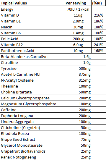Acidulante (ácido cítrico, ácido málico), beta-alanina como CarnoSyn®, L-citrulina, reguladores de la acidez (bicarbonato de sodio, bicarbonato de potasio), agentes antiaglomerante (dióxido de silicio, silicato de calcio), saborizante, bitartrato de colina, L-tirosina, acetil L-carnitina HCl, N-acetil cisteína, glicerofosfato de magnesio, colorante (rojo remolacha), glicerofosfato de calcio, cafeína, extracto de ojo de dragón (euphoria longana) (pulpa del fruto), piridoxina HCl, L-teanina, extracto de raíz Lindera aggregata, extracto de raíz de Rhodiola rosea, complejo de bioflavonoides de pomelo, extracto de semilla de uva (vitis vinifera), edulcorantes (sucralosa, acesulfamo K), polvo de espirulina, citicolina (Cognizin®), monoestearato de glicerol, nicotinamida, extracto de raíz de Panax notoginseng, d-pantotenato de calcio, cianocobalamina, colecalciferol, ácido pteroilmonoglutamico, tiamina clorhidrato.
