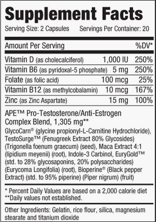 APE™ además de su explosivo trío de componentes patentados, completa su fórmula con extracto de Maca, que mejora la libido y el deseo sexual, Indol-3-Carbinol, un potente y poderoso ingrediente anti-estrógeno así como zinc, vitamina D, vitamina B6, vitamina B12 y ácido fólico.