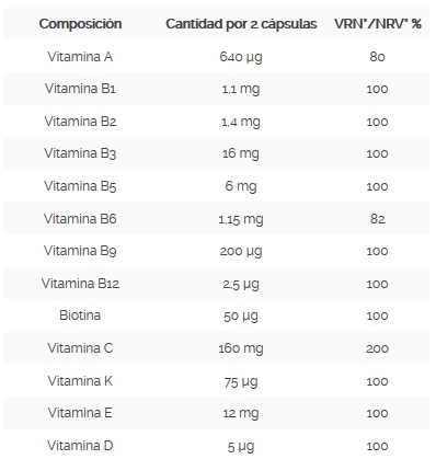 Su fórmula incluye vitamina C (ácido L-ascórbico), vitamina E (acetato de D,L-alfa-tocoferilo), vitamina B3 (nicotinamida), vitamina A (acetato de retinilo), beta-caroteno, vitamina B6 (clorhidrato de piridoxina), vitamina K (filoquinona), vitamina B2 (riboflavina), vitamina B1 (clorhidrato de tiamina), vitamina B9 (ácido pteroilmonoglutámico), D-biotina, vitamina D (colecalciferol) y vitamina B12 (cianocobalamina).