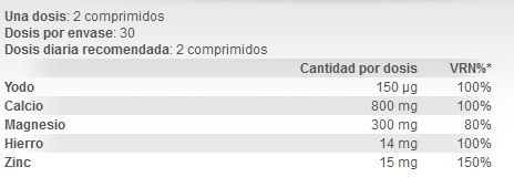 Fosfato dicálcico, carbonato de calcio, agentes de carga (celulosa microcristalina, dióxido de silicio coloidal), óxido de magnesio, caseinato de sodio (de leche), gluconato de zinc, antiaglomerantes (talco, estearato de magnesio), fumarato ferroso (II), selenito de sodio, molibdato de sodio, gluconato de cobre, sulfato de manganeso monohidrato, yoduro de potasio.