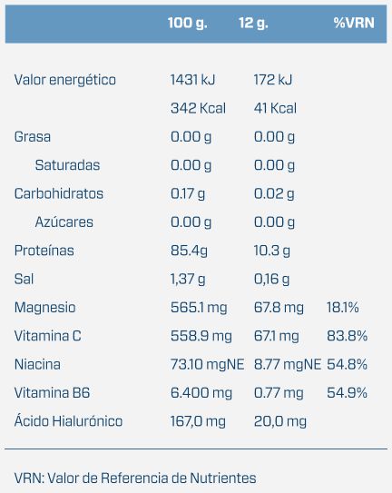 Sabor neutro: Colágeno Hidrolizado Bovino (Peptan®), Carbonato Magnésico, Acidulante (Ácido Cítrico), Vitamina C (L-Ascorbato Cálcico), Hialuronato sódico, Edulcorante (Glucósidos de Esteviol), Niacina (Nicotinamida) y Vitamina B6 (Piridoxina Clorhidrato).