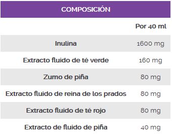 Agua, inulina, acidulante (ácido cítrico) extracto fluido de té verde (Camelia Sinensis), zumo de granada (Punica granatum), extracto fluido de reina de los prados (Filipendula Ulmaria L. Maxim), extracto fluido de té rojo (Camellia Sinensis L. Kuntze), aromas,conservantes (benzoato sódico y sorbato potásico), edulcorantes (sucralosa, acesulfamo K y sacarina sódica) y colorante (azorrubina).