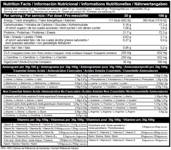 - Enriquecido con CLA y L-Carnitina para ayudar a la eliminación de la grasa corporal.