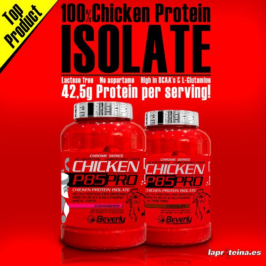 Chicken P85 Pro de Beverly Nutrition es un suplemento proteico en polvo que contiene aislado de proteína de pollo, una proteína de origen animal única, que tiene una gran pureza, prácticamente sin grasa, libre de lactosa y que se convierte en una excelente elección para todos aquellos deportistas que buscan una alternativa a las proteínas de suero.