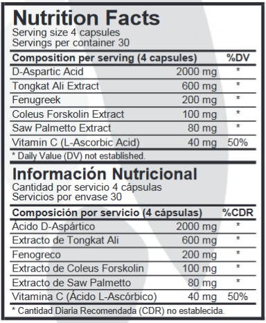 Ácido D-aspártico, extracto de tongkat ali, fenogreco, extracto de coleus forskolin, extracto de saw palmetto, vitamina C (Ácido L-ascórbico), gelatina (cápsula), agente de carga: Silica, antiaglomerante: Estearato de magnesio.