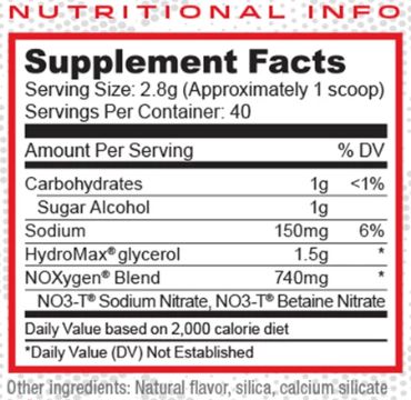 Glicerol Hydromax™, NO3-T™ (nitrato de sodio), NO3-T™ (nitrato de betaína), sílice, silicato de calcio, sabores naturales.