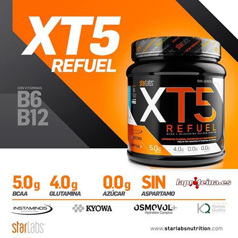 XT5 Refuel de StarLabs es un suplemento en polvo que contiene una mezcla de vanguardia con los aminoácidos anabólicos más importantes como son los BCAAs de la mejor calidad InstAminos™ y la glutamina Kyowa™ que es reconocido mundialmente como el mejor fabricante de aminoácidos por su calidad y su pureza junto con un complejo para la hidratación celular con las vitaminas y minerales clave (Osmovol+ Hydration Complex®).