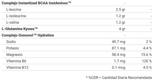 Contiene BCAAs InstAminos™ con ratio 2:1:1, glutamina Kyowa™ y un complejo para la hidratación celular con las vitaminas y minerales clave (Osmovol+ Hydration Complex®).