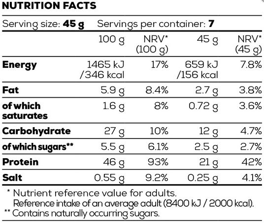 Gusto Protein Blend (concentrado de proteína de suero de leche, leche desnatada en polvo, huevo entero en polvo, caseína, clara de huevo en polvo), harina de arroz, chocolate en polvo [masa de cacao, edulcorante (maltitol), manteca de cacao, emulgente (lecitina de soja), aroma natural de vainilla] agentes decarga (hidrogenocarbonato de sodio, pirofosfato de sodio), aromas, vanilina, espesante (goma xantana), edulcorantes (sucralosa, glicósidos de esteviol). Elaborado en una fábrica que produce alimentos que contienen mostaza.