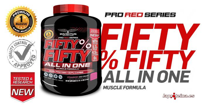Fifty % Fifty All in One de Invictus Nutrition es una fórmula que combina aproximadamente un 40% de concentrado de suero de leche de la más alta calidad con un 50% de harina de avena ideal para aquellas personas que buscan aumentar la masa muscular pero evitando una ganancia indeseada de grasa.