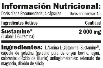 L-alanina-L-Glutamina Sustamine™, cápsula de gelatina (gelatina pura de origen bovino, agua, colorante: dióxido de titanio) antiaglomerantes: estearato de magnesio, dióxido de silicio.