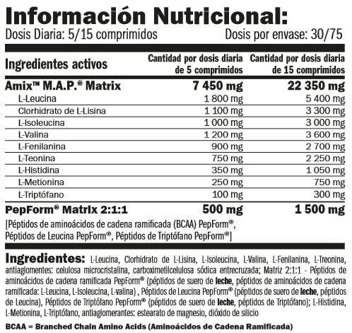 L-Leucina, clorhidrato de L-Lisina, L-Isoleucina, L-Valina, L-Fenilanina, L-Treonina, antiaglomentes: celulosa microcristalina, carboximetilcelulosa sódica entrecruzada; Matriz 2:1:1 Péptidos de aminoácidos de cadena ramificada PepForm™ (péptidos de suero de leche, péptidos de aminoácidos de cadena ramificada: L-Leucina, L-Isoleucina, L-valina), Péptidos de Leucina PepForm™ (péptidos de suero de leche, péptidos de Leucina), Péptidos de Triptófano PepForm™ (péptidos de suero de leche, péptidos de Triptófano); L-Histidina, L-Metionina, L-Triptófano, antiaglomerantes: estearato de magnesio, dióxido de silicio.