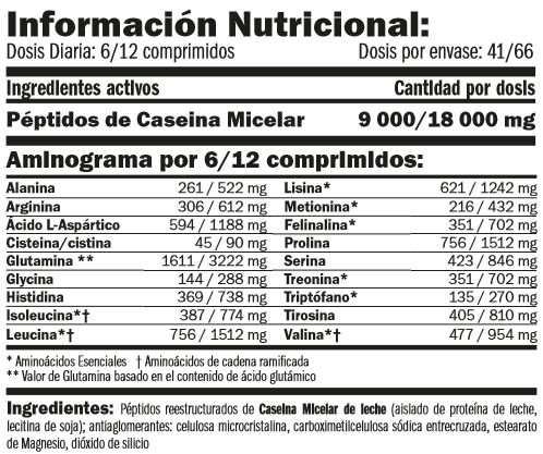 Péptidos reestructurados de caseina micelar de leche (aislado de proteína de leche, lecitina de soja); antiaglomerantes: celulosa microcristalina, carboximetilcelulosa sódica entrecruzada, estearato de Magnesio, dióxido de silicio.