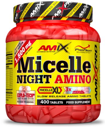 Micelle Night Amino de Amix™ Advanced Nutrition es un revolucionario y novedoso complemento alimenticio en tabletas que contiene Micelle XL™, unos péptidos reestructurados de caseina micelar especialmente diseñados para ser utilizados antes de ir a dormir o para tomar entre horas debido a su lenta digestión.