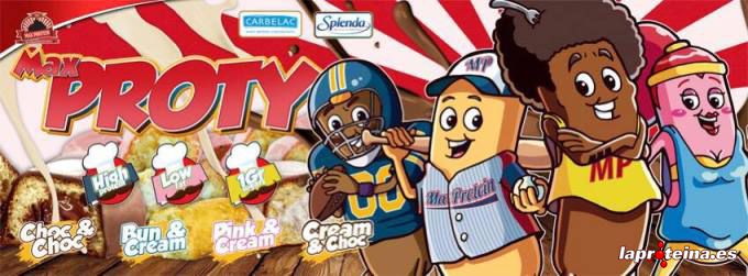 Max Proty de la línea Max Protein de Universal McGregror son unos deliciosos pastelitos con un excelente valor nutricional disponibles en 4 fabulosos sabores distintos (Cream&Choc, Choc&Choc, Pink&Cream y Bun&Cream), rellenos de crema y con cobertura exterior de chocolate.