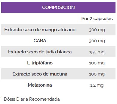 Extracto seco de mango africano (Irvingia gabonensis Aubry-le Comte ex O´Rorke), ácido gamma-aminobutírico (GABA), extracto seco de judía blanca (Phaseolus vulgaris L.), L triptófano, extracto seco de mucuna (Mucuna pruriens L), melatonina y antiaglomerante (estearato de magnesio vegetal).