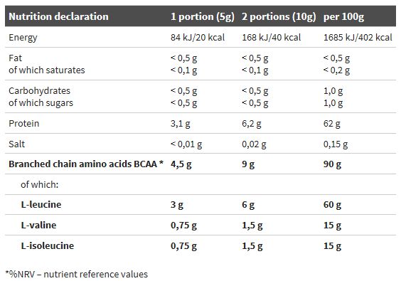 - Proporciona 4,5 gramos de BCAAs con ratio 4:1:1 por dosis de 5 gramos.