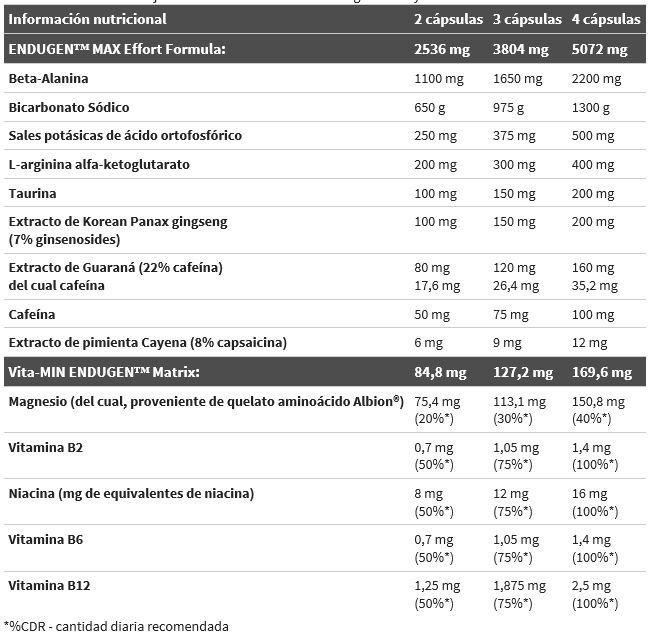 Fórmula Endugen™ Max Esfuerzo (Beta-alanina, bicarbonato de sodio, sal potásica o ácido ortofosfórico, L-arginina alfa-cetoglutarato, taurina, extracto de ginseng Koreano Panax (7% ginsenosides), extracto de guaraná (22% cafeína), cafeína, extracto de pimienta cayena (8% capsaicina)), Vita-Min Endugen™ Matrix (magnesio (de cual quelato aminoácido Albion®) (40%*), vtamina B2 (100%*), niacina (100%*), vitamina B6 (100%*), vitamina B12 (100%*).