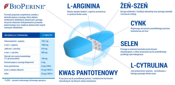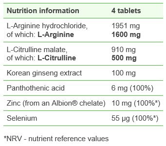 Clorhidrato de L-arginina, agente de carga - celulosa microcristalina, malato de L-citrulina, agentes de acristalamiento - alcohol polivinílico, polietilenglicol, talco; Extracto de ginseng coreano (Panax ginseng coreano), anti-aglomerantes - dióxido de silicio, sales de magnesio de ácidos grasos; Bisglicinato de zinc (quelato de aminoácidos de zinc Albion®), selenito de sodio (IV); D-pantotenato de calcio (ácido pantoténico), colores: E 171, E 133.