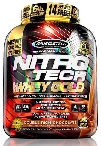 Nitro Tech™ 100% Whey Gold de MuscleTech es una proteína premium que contiene como fuente proteica principal una mezcla de péptidos y aislado de suero de leche, reforzada con concentrado de suero para aportar alrededor de 24 gramos de proteína de la mejor calidad, con 5,5 gramos de BCAAs y 4 gramos de glutamina por servicio, diseñada para proporcionarte el máximo crecimiento muscular.