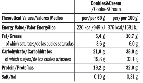 Proteínas de la leche, cobertura de chocolate con leche (16,3%) [azúcar, manteca de cacao, pasta de cacao, leche en polvo, lactosuero en polvo, emulgente:lecitina de soja y aromas], jarabe de glucosa, jarabe de fructosa, isomaltooligosacáridos en polvo, agua, aceite de palma, maltodextrina, dextrosa, aromas, cacao en polvo, clara de huevo, corrector de acidez: ácido cítrico, conservantes:sorbato potásico, benzoato sódico.