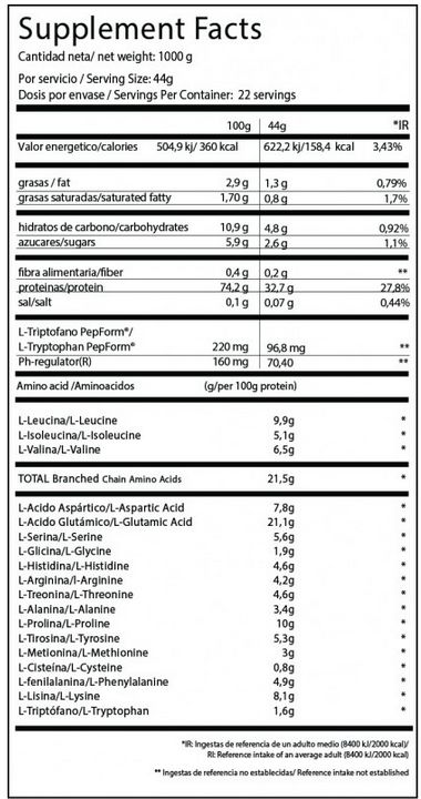 Contiene Solmiko®, una caseína micelar de primera calidad y de liberación lenta procedente de la leche. Enriquecida con PepForm® péptidos de triptófano.