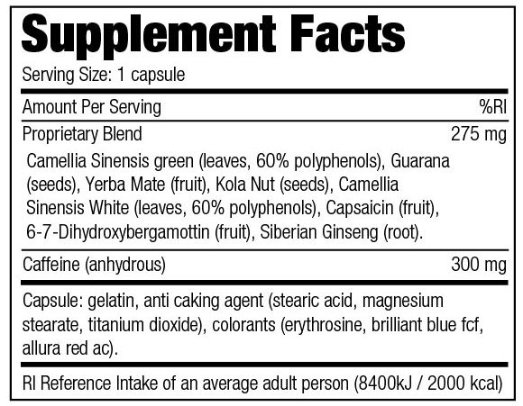 Mezcla patentada (extracto de hoja de té verde (Camellia Sinensis) (60% polifenoles), semilla de guaraná, yerba mate (fruto), nuez de cola (semilla), extracto de hoja de té blanco (Camellia Sinensis) (60% polifenoles), capsaicina (fruto), extracto de raíz de ginseng siberiano, 6-7 dihidroxibergamotina (fruto), ginseng siberiano (raíz)), cafeína anhidra.