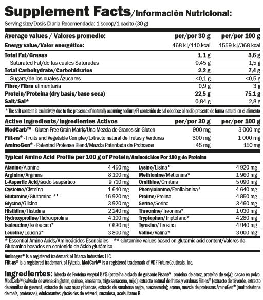 Mezcla proteica vegetal 87% (aislado de proteína de guisante Pisane®, proteína de arroz, proteína de soja); cacao en polvo, ModCarb™ (salvado de avena sin gluten, quinoa, amaranto, alforfón, mijo), extractos y concentrados de frutas y hortalizas Fiit-ns® (extracto de té verde, extracto de guaraná, extractos de uva roja y blanca, extracto de pomelo, extracto de zanahoria negra, nicotinamida), aroma, mezcla patentada de proteasa AminoGen® (maltodextrina, proteasas), edulcorantes: glicósidos de esteviol, sucralosa y acesulfamo-K.