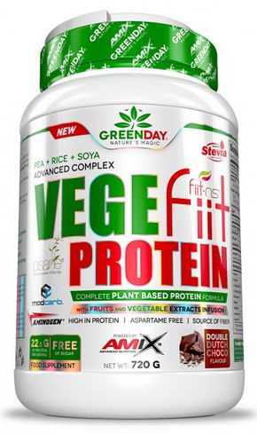 GreenDay® VegeFiit Protein de Amix es un suplemento en polvo que contiene una mezcla de proteínas de origen vegetal compuesta por aislado de proteína de guisante Pisane®, proteína de arroz y proteína de soja; enriquecida con ModCarb™, una mezcla de 5 carbohidratos de granos saludables y sin gluten; AminoGen®, una combinación de enzimas de origen vegetal; y Fiit-ns®, una combinación patentada de extractos naturales con propiedades antioxidantes.