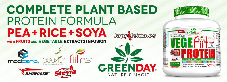 GreenDay® Vegefiit Protein es un complemento alimenticio basado en una combinación de tres diferentes fuentes de proteínas de origen vegetal: aislado de proteína de guisante Pisane®, proteína de arroz y proteína de soja. Estas diferentes fuentes de proteína se complementan entre ellas dando como resultado una proteína de alto valor biológico, alta en BCAA´s y Glutamina, favoreciendo una regeneración muscular óptima en personas que quieran una alternativa a las fuentes de proteína de origen animal.